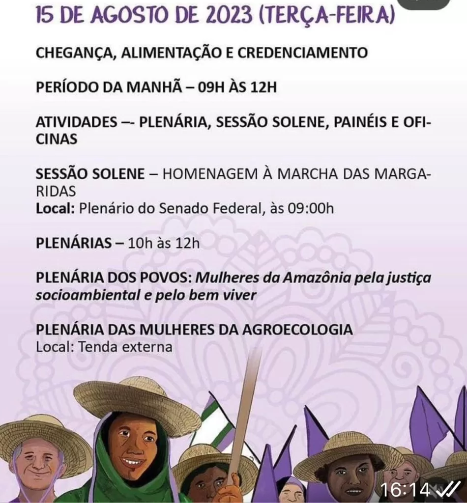 No período da tarde, das 14h às 16h, as atividades continuam com plenárias dedicadas à juventude, seminários, conversas sobre violência e suas formas de enfrentamento, além de tribunais éticos das mulheres do campo, da floresta e das águas. Painéis abordarão a construção de políticas públicas para o bem viver, as mudanças climáticas e a promoção da justiça ambiental.