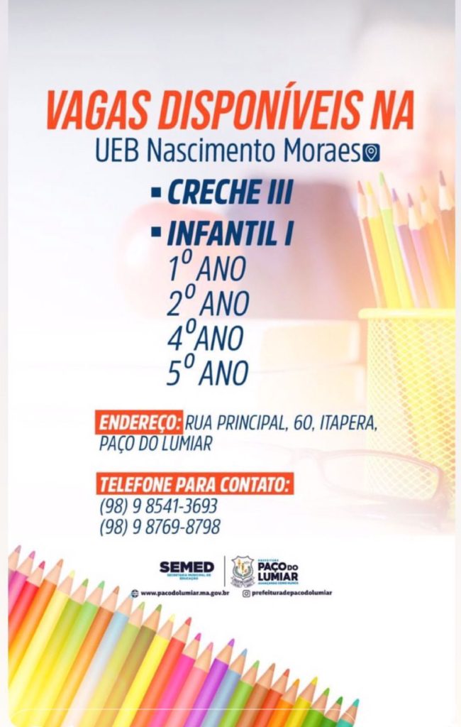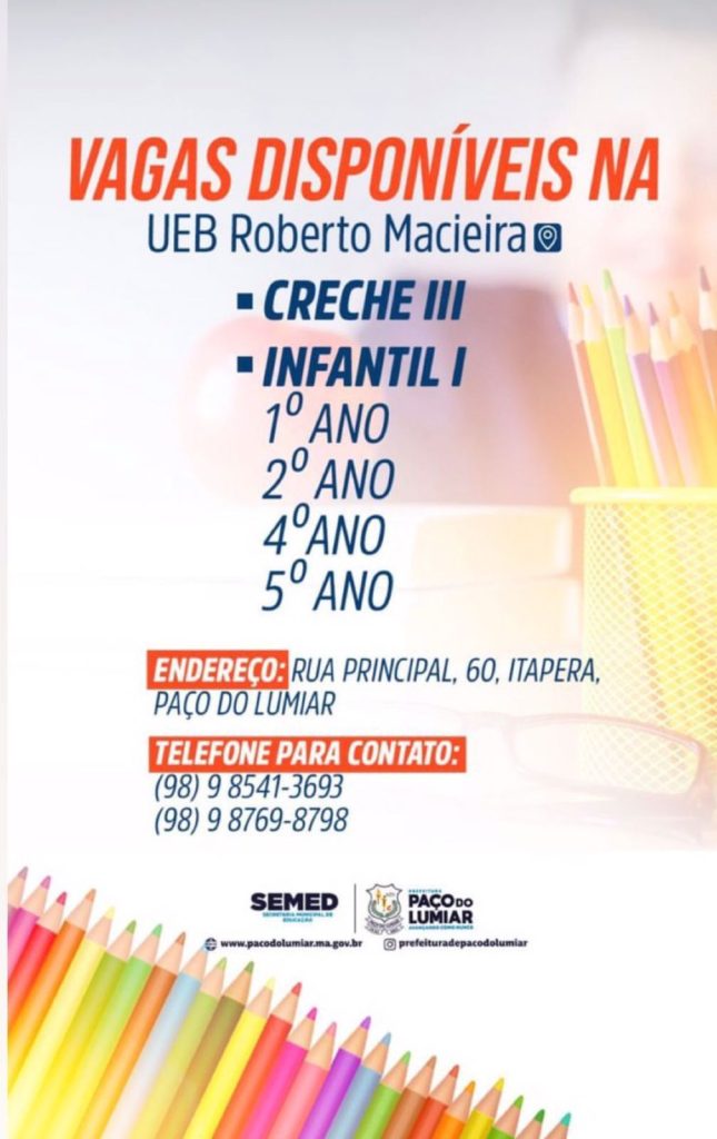 A Secretaria Municipal de Educação de Paço do Lumiar, sob o comando de Yanne Pessoa anunciou a abertura de novas vagas na rede municipal de ensino.