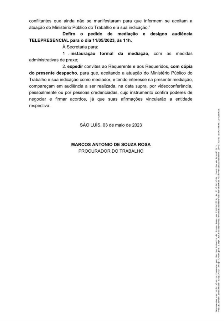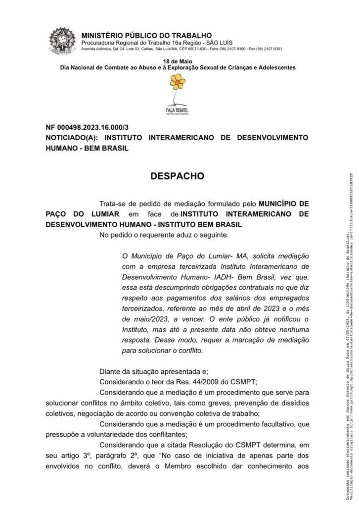 Objetivando, exatamente, não adimplir duplamente, ocasionando perdas financeiras ao ente público, além de proteger o lado mais frágil na relação trabalhista, no caso, o contratado – que a Prefeitura de Paço do Lumiar recorreu à Justiça do Trabalho, conforme documento abaixo publicado, para mediar uma audiência na próxima quarta-feira(11) com o Instituto Interamericano de Desenvolvimento Humano – Bem Brasil.