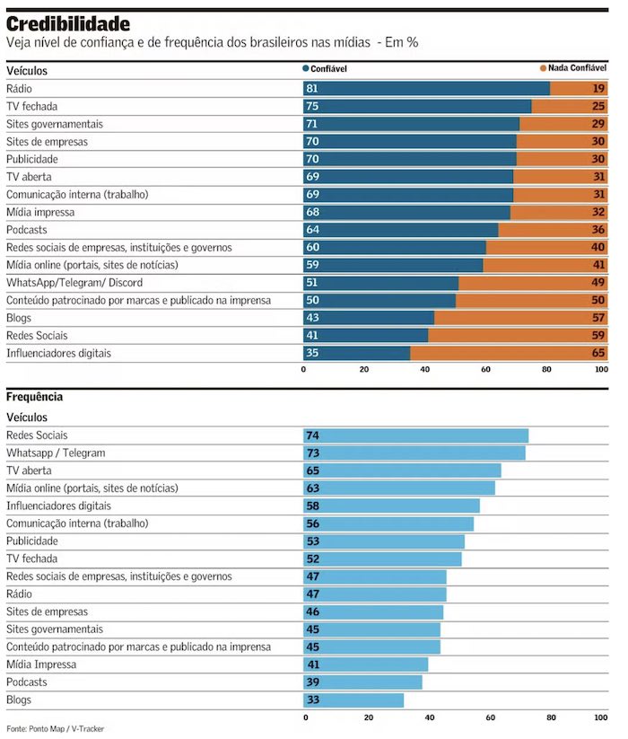 A pesquisa também revela uma inversão entre acesso e confiança: os meios mais utilizados nem sempre são os mais confiáveis. As redes sociais e os aplicativos de mensagem são exemplos desse fenômeno. Enquanto os aplicativos de mensagem possuem 73% de frequência de acesso, sua credibilidade é de 51%, desempenho superior ao das redes sociais, mas ainda abaixo dos veículos tradicionais.