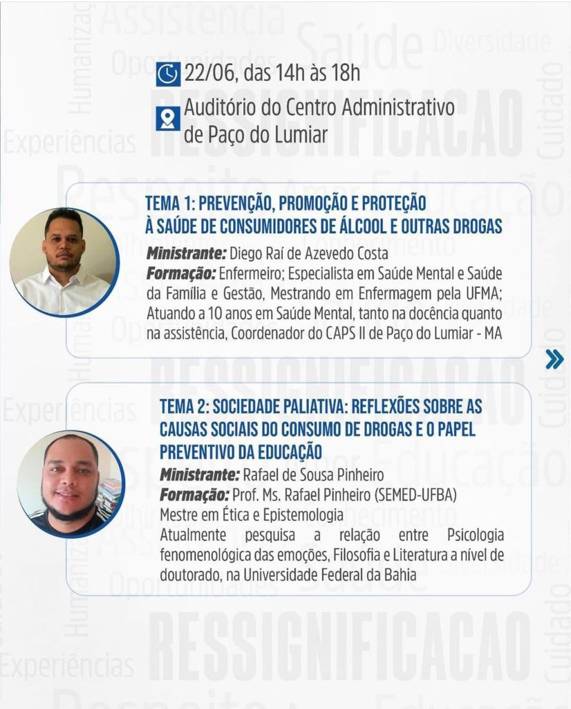 A Prefeitura de Paço do Lumiar, sob o comando da prefeita Paula Azevedo(PCdoB) promoverá a partir desta quinta-feira(22), uma semana de conscientização sobre a Política sobre Drogas. O evento tem como objetivo garantir o pleno exercício dos direitos à saúde, educação e assistência social para pessoas em situação de drogadição, considerando suas diversidades.