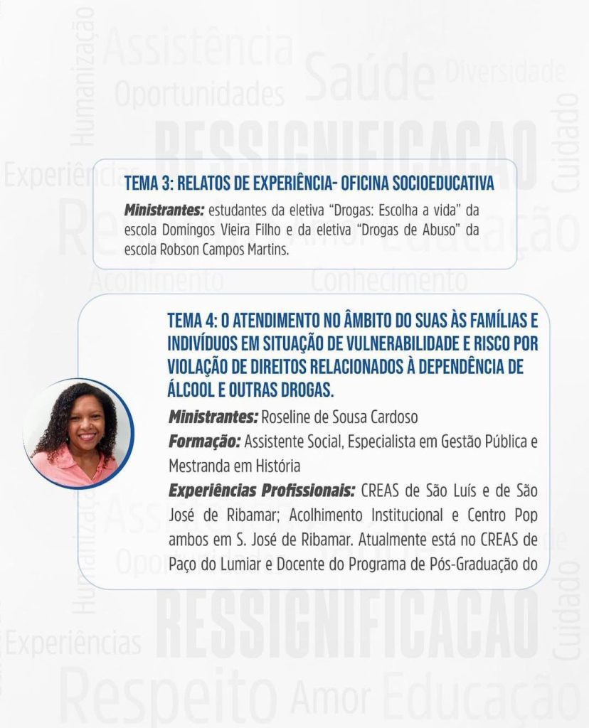 “Essa iniciativa visa informar e debater sobre a importância de políticas públicas efetivas no enfrentamento às drogas, assim como no cuidado e assistência às pessoas afetadas por esse desafio. A participação da comunidade é fundamental para a construção de uma sociedade mais acolhedora e inclusiva”, explicou a secretária.