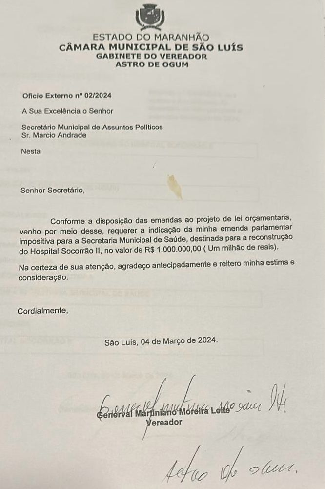 Na sessão desta quarta-feira(06) no plenário Simão Estácio da Silveira, na Câmara de São Luis, ao fazer uso da palavra, o vereador Astro de Ogum(PCdoB), decano no Parlamento Ludovicense- anunciou aos pares que destinou parte da emenda impositiva para ajudar na construção do Socorrão 2, que está sendo reformado objetivando melhor atender a população de São Luís e municípios próximos.
